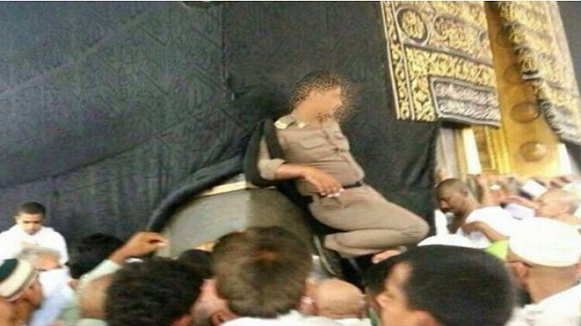 رجل أمن سعودي يتكئ على الكعبة ويضع قدمه على الحجر الأسود
