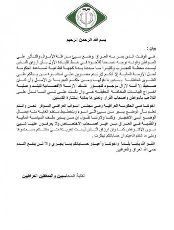 وقالت النقابة في بيان ورد ل وكالة من كربلاء الخبر "في الوقت الذي يمر به العراق بوضع سيئ من قلة الأموال والتأثير على المواطن وقوته‎ نوجه نصحنا للأخوة في خط القيادة الأول‎ بأن أرزاق الناس ليست محطة للتجارب وكثيراً ما مددنا يدنا كجهة قطاعية لمساعدة الحكومة لحل الازمة المالية إلا أنكم لا زلتم مصرين على استشارة من يدلكم على الطرق الخاطئة".