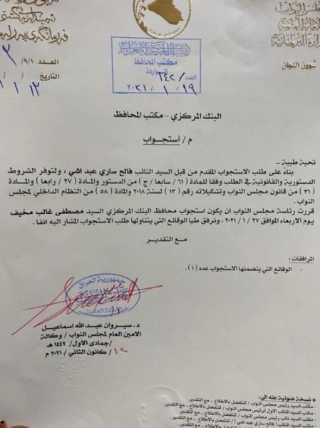 واظهرت وثيقة صادرة عن مجلس النواب، تحديد يوم الاربعاء المقبل المصادف 27 كانون الثاني 2021، موعدًا لاستجواب محافظ البنك المركزي مصطفى غالب مخيف، على خلفية الطلب المقدم من النائب فالح ساري