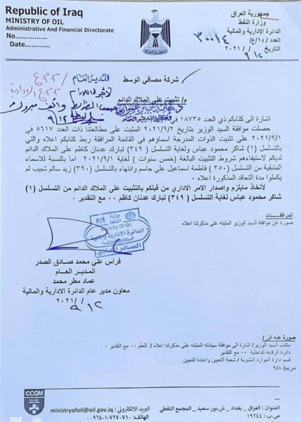 وقال مدير شكة مصافي الوسط عائد جابر في بيان لصحفي: "تزف إدارة شركة مصافي الوسط بشرى تثبيت العقود في الشركة على الملاك الدائم، ممن مضى على عملهم فترة لاتقل عن خمسة سنوات".