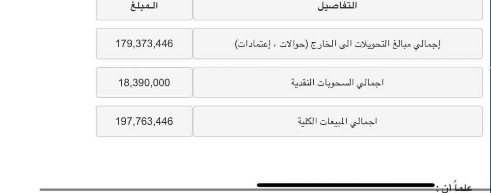 وطبقًا للجدول، فإن "معظم المبيعات من الدولار ذهبت لتعزيز الأرصدة في الخارج على شكل (حوالات، اعتمادات) وبواقع 189 مليوناً و602 ألفاً و703 دولاراً، فيما ذهبت البقية البالغة 20 مليوناً و 931 الف دولار على شكل مبيعات نقدية".