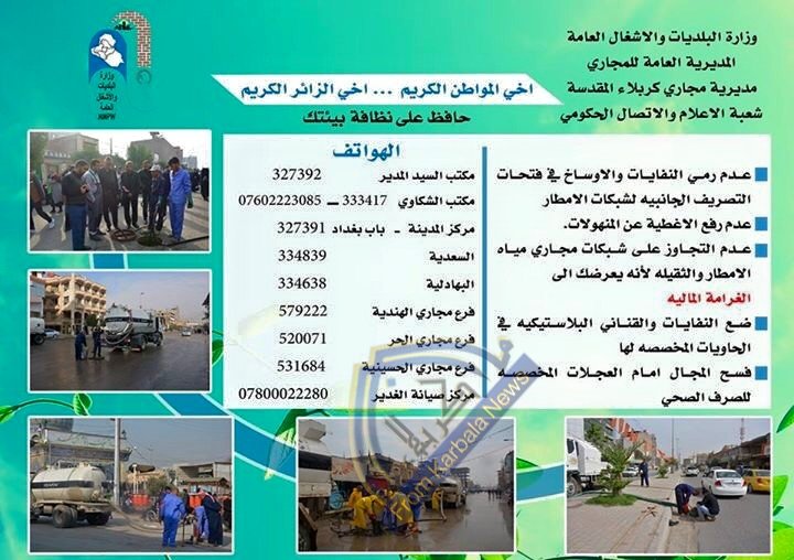 بلدية كربلاء تصدر توجيهات الى اصحاب المواكب والزائرين للحفاظ علة نظافة المدينة