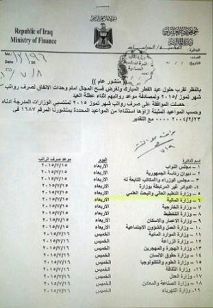 المالية تحدد الـ15-16 من تموز الحالي موعدا لتوزيع رواتب منتسبي الوزارات الحكومية
