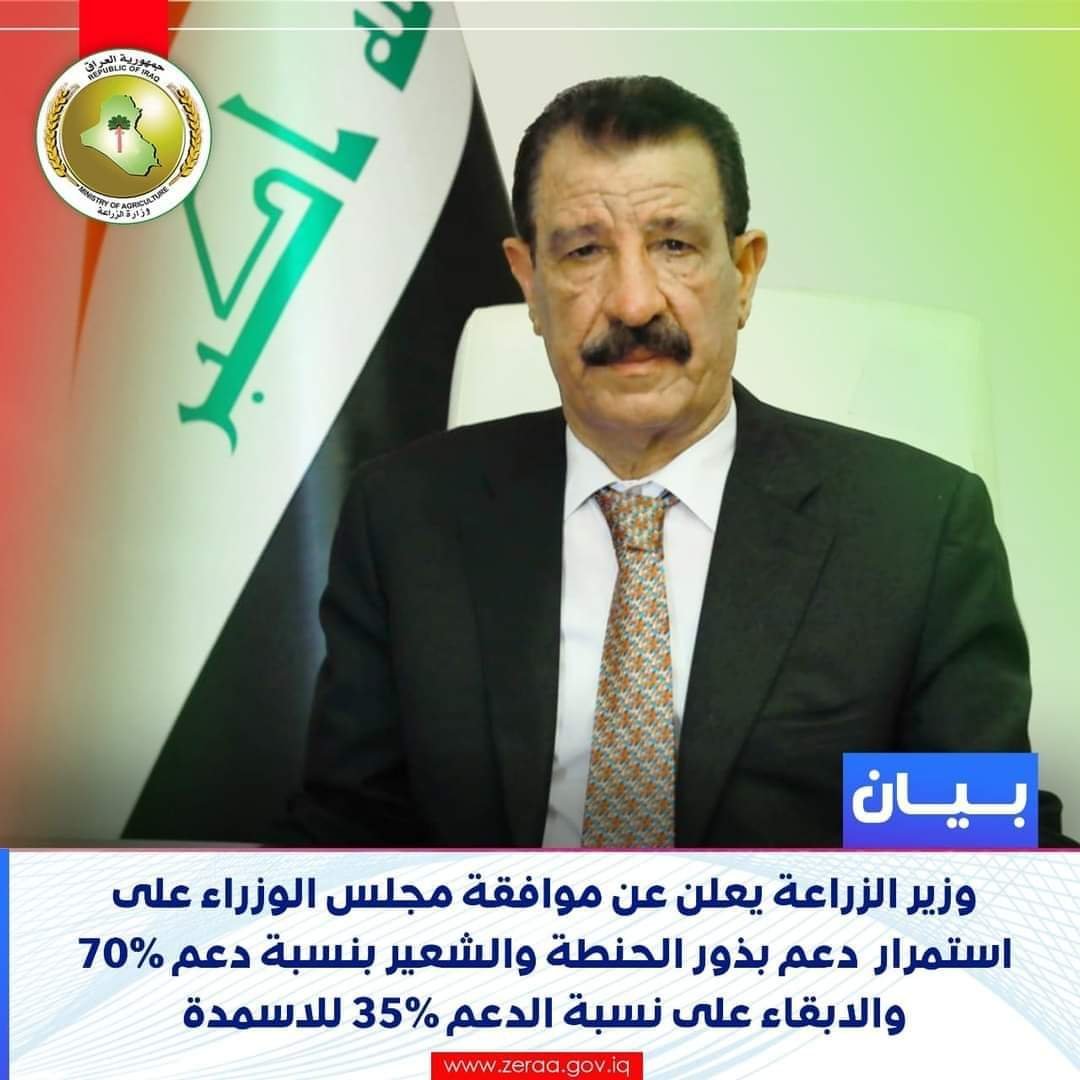 وزير الزراعة يعلن عن موافقة مجلس الوزراء بالاستمرار في دعم بذور الحنطة والشعير