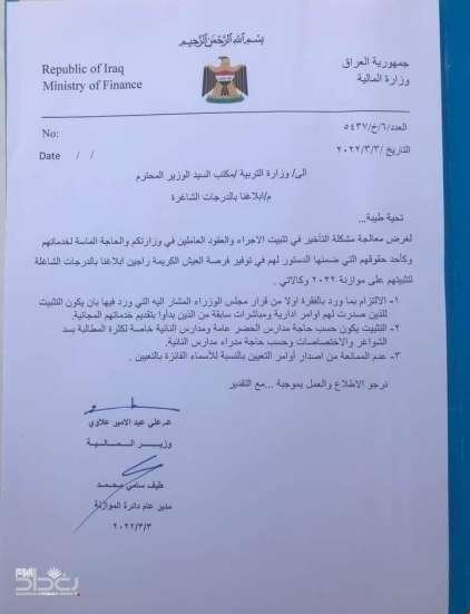 المالية تخاطب التربية بشأن تثبيت العقود والاجور (وثيقة)