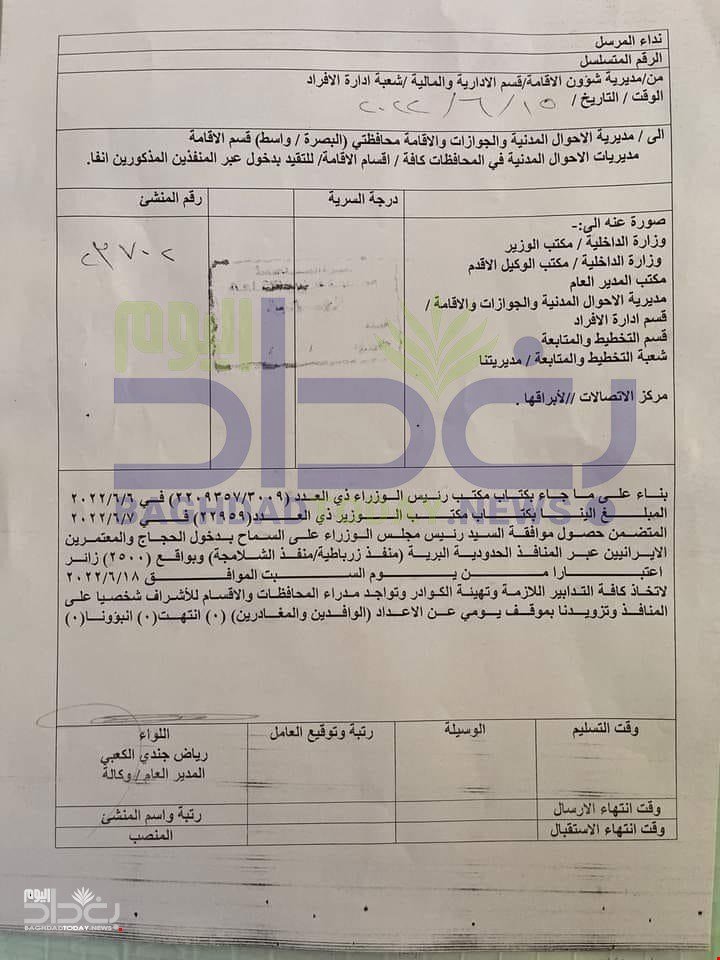 ونصت الوثيقة الموجهة الى مديرية الاحوال المدنية والجوازات والاقامة بمحافظتي البصرة وواسط، وحصلت عليها ، فأنه "بناءً على توجيه مكتب رئيس الوزراء الصادر في 6/6/2022 المتضمن حصول موافقة رئيس مجلس الوزراء على السماح بدخول الحجاج والمعتمرين الايرانيين عبر المنافذ الحدودية البرية (زرباطية/ الشلامجة) وبواقع 2500 زائر اعتبارا  من يوم السبت الموافق 18/6/2022".