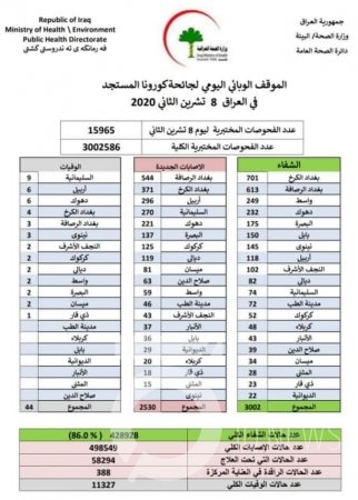أعلنت وزارة الصحة، الأحد (8 تشرين الثاني 2020)، تسجيل 2530 إصابة جديدة بفيروس كورونا، مقابل 3002 حالة تعافٍ و44 حالة وفاة ناجمة عن الفيروس خلال الساعات الأربع والعشرين الماضية.