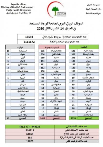 وذكرت الوزارة في بيان ، انه "تم تسجيل 2419 إصابة جديدة بفيروس كورونا"، مؤكدة "تماثل 2370 حالة للشفاء في عموم البلاد"