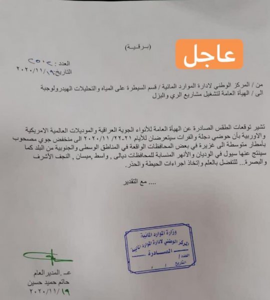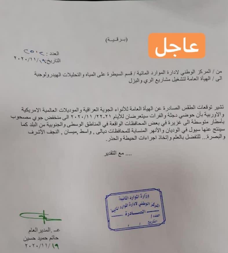 وبحسب وثيقة حصلت وكالة من كربلاء الخبر على نسخة منها فأن "المركز الوطني لادارة الموارد المائية وجه الهيأة العامة لتشغيل مشاريع الري والبزل باتخاذ اجراءات الحيطة والحذر بسبب توقعات بتعرض حوضي دجلة والفرات الى امطار متوسطة الى غزيرة يومي الاحد والاثنين في المحافظات الواقعة ضمن وسط وجنوبي العراق مما سيؤدي الى حدوث سيول في الوديان والانهر المنسابة لمحافظات ديالى، واسط، ميسان، النجف الاشرف، والبصرة"