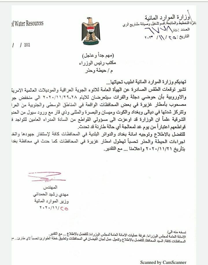 وجهت وزارة الموارد المائية تحذيراً عاجلاً جداً ، الاربعاء من تعرض سبع محافظات عراقية لسيول نهاية الشهر الجاري.وحملت وثيقة حصلت عليها وكالة من كربلاء الخبر موقع من وزير الموارد مهدي الحمداني تحذيراً موجها لمكتب رئيس الوزراء من حصول موجة أمطار غزيرة يومي 28-29 تشرين الثاني الجاري ما قد يمهد لحصول سيول في 7 محافظات.التفاصيل الكاملة في الوثيقة المبين تفاصيلها ادناه.