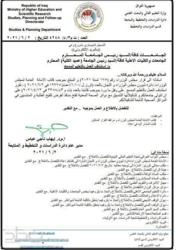 وحصل مصدر صحفي، على وثيقة صادرة من وزارة التعليم العالي، موجهة إلى الجامعات والكليات الأهلية، جاء فيها أنه "تقرر استئناف العمل بالتعليم المدمج، على أن تتولى جامعاتكم وتشكيلاتها التنسيق مع دوائر الصحة المعنية لفتح منافذ لغرض تلقيح الطلبة والمنتسبين في المراكز الصحية التابعة لتشكلاتكم".