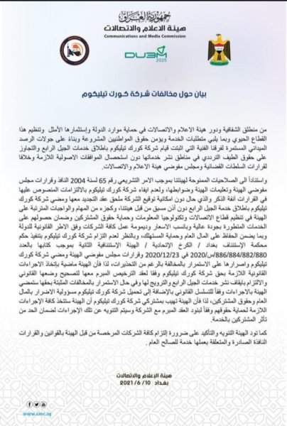 قررت هيئة الاعلام والاتصالات ايقاف خدمات الجيل الرابع لشركة كورك، لادخالها الخدمة دون اتمام الاجراءات القانونية والتعاقدية مع هيئة الاعلام والاتصالات.