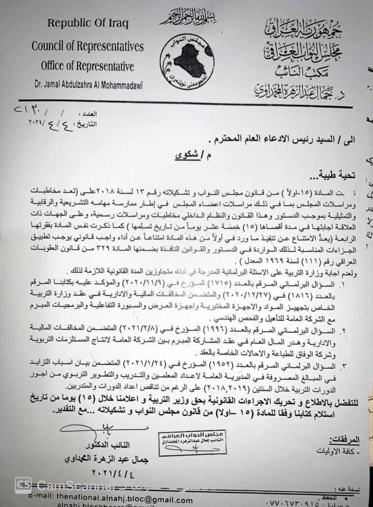 وكشفت وثيقة صادرة من مكتب النائب جمال المحمداوي مقدمة إلى رئيس الادعاء العام يطالب فيها بتحريك الإجراءات القانونية بحق وزير التربية وذلك لعدم اجابة وزارته على الأسئلة البرلمانية وتجاوز المدة القانونية اللازمة لذلك.