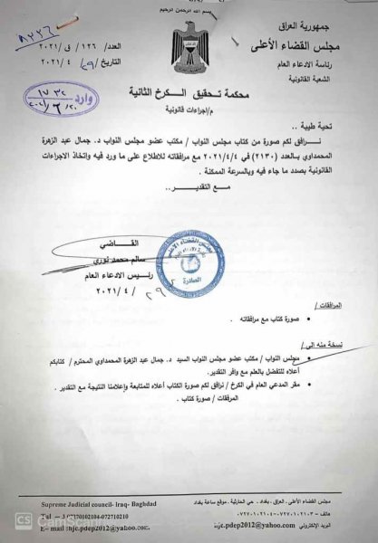 وفي الشأن ذاته كشفت وثيقة صادرة من مجلس القضاء الاعلى / الادعاء العام، اتخاذ الإجراءات القانونية بشأن شكوى النائب جمال المحمداوي.