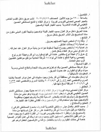 حصل مصدر صحفي ، على نسخة من التقرير المفصل لحادثة حريق مستشفى الحسين التعليمي، والذي أظهر تضاربا مع الإحصائية التي أعلنتها وزارة الصحة اليوم.