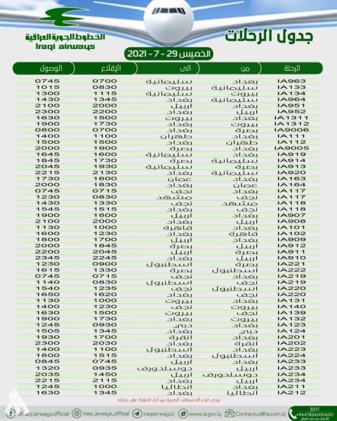 أعلنت الخطوط الجوية العراقية، اليوم الاربعاء، مواعيد رحلاتها ليوم غد الخميس. وبحسب الجدول أدناه فإن عدد الرحلات بلغ 52 رحلة، توزعت بين داخلية وخارجية، إذ بلغ عدد الرحلات الداخلية 22 رحلة، والخارجية 30 رحلة.