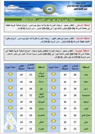واشارت إلى ان "درجات الحرارة ليوم الاحد سترتفع قليلاً وتكون الرياح شمالية غربية خفيفة السرعة وتصل (10-20 )كم/س ومدى الرؤية (8-10)كم ".