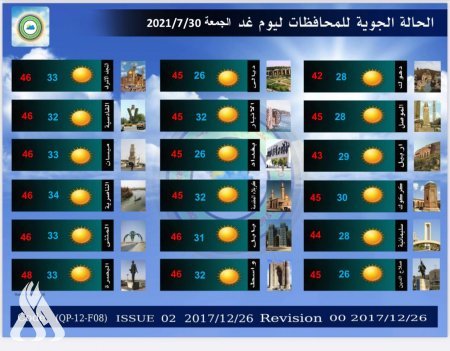 وقالت الهيأة في بيان لها، إن "الطقس ليوم غد الجمعة سيكون صحواً والرياح شمالية غربية خفيفة الى معتدلة السرعة (10-20) كم/س ،ومدى الرؤية (8-10) كم.
