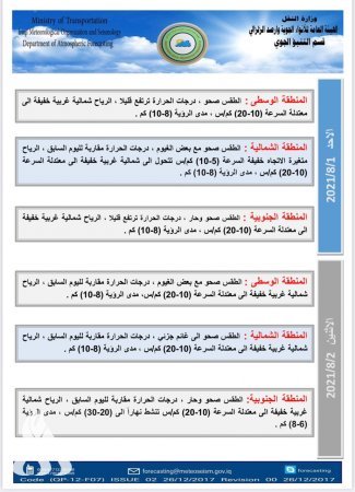 فيما اشارت الى ان" طقس يوم الاثنين سيكون صحو ودرجات الحرارة مقاربة لليوم الذي يسبقة فيما ستكون الرياح شمالية غربية خفيفة الى معتدلة السرعة (10-20 )كم /س ومدى الرؤية سيكون (8-10)كم /س