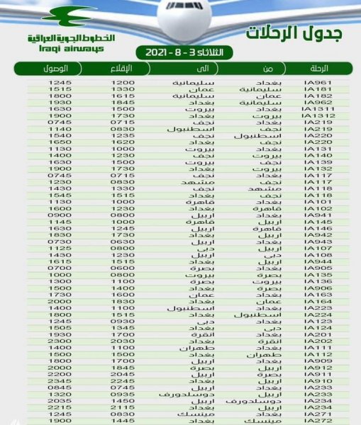 اعلنت الخطوط الجوية العراقية ،اليوم الاثنين ،موعد رحلاتها ليوم غد الثلاثاء.