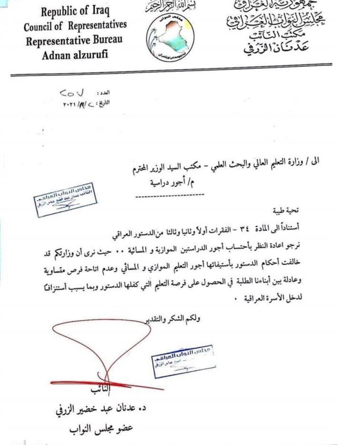 : "استنادا الى المادة 34 في الفقرات أولا وثانيا وثالثا من الدستور العراقي نرجو إعادة النظر باحتساب أجور الدراستين المسائي والموازي".