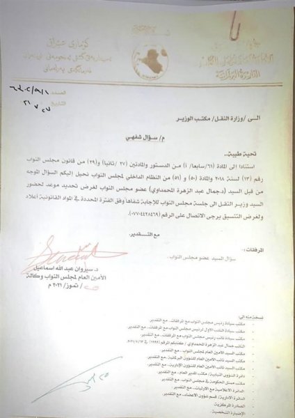 وأظهرت وثيقة حصل عليها مصدر صحفي ، انه "استنادا لأحكام المادة (٦١/سابعاً /أ) من الدستور والمادتين (٢٧/ ثانيا) و(٢٩) من قانون مجلس النواب رقم (١٣) لسنة ٢٠١٨ والمادة (٥٠)و(٥١) من النظام الداخلي للمجلس يتم إحالة السؤال الموجه من قبل النائب جمال المحمداوي موجه إلى وزير النقل لتحديد موعد لحضوره إلى مبنى البرلمان، وفق الفترة المحددة في المواد القانونية ".وأضاف أن "السؤال النيابي يتعلق بعقد مبرم التشغيل المشترك المبرم بين الشركة العامة لموانئ العراق وشركة جوار الخليج والذي يكبد الدولة خسائر تقدر بـ ٥٠ مليار دينار سنوياً".وكان النائب جمال المحمداوي قد طالب في وقت سابق رئاسة البرلمان بتحديد موعد لحضور الوزير الى جلسة مجلس النواب للإجابة شفاهيا عن الاسئلة البرلمانية .![]()