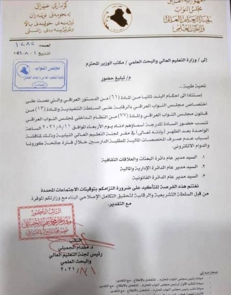 وجاء في وثيقة تحمل توقيع رئيس اللجنة النائب مقدام الجميلي، إن "التعليم النيابية استدعت اليوم كل من مدير عام دائرة البعثات، مدير عام الدائرة الادارية والمالية ومدير عام الدائرة القانونية بوزارة التعليم العالي لمناقشة اسباب عدم صرف المخصصات المالية للطلبة الدارسين خلال فترة جائحة كورونا".![]()