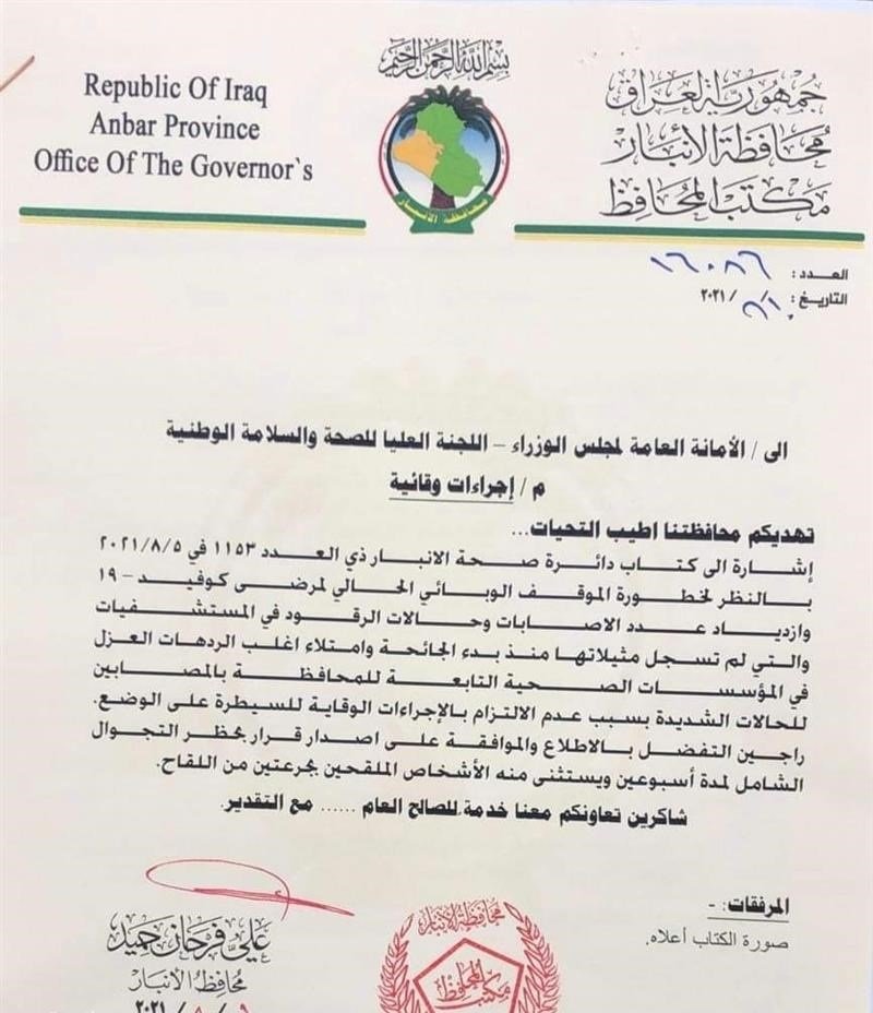 خاطبت محافظة الأنبار اليوم الثلاثاء اللجنة العليا للصحة و السلامة بفرض حظر شامل لأسبوعين بسبب تداعيات فيروس كورونا.