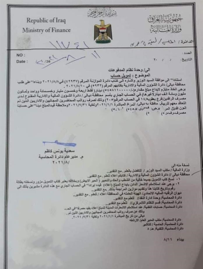 وافقت وزارة المالية على طلب موجه لها من محافظة ديالى حيث أودعت الوزارة أكثر من 54 مليار دينار لتمويل مستحقات المحاضرين في المحافظة.