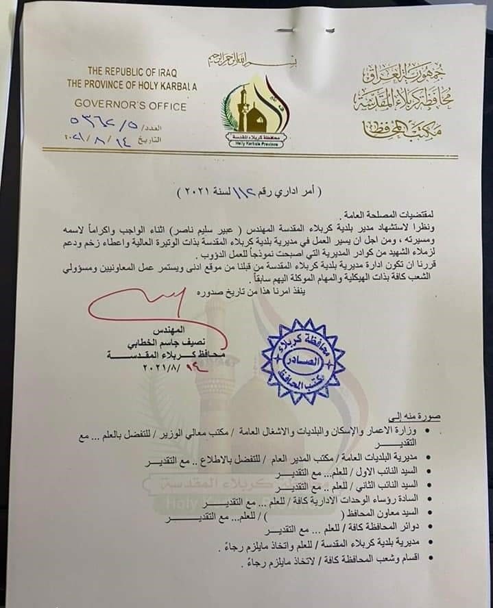 وأضاف ان "المحافظ اكد خلال الاجتماع على ان مسيرة الاعمار والبناء والخدمات تستمر بوتيرة عالية وان دم الشهيد سيكون وقودا حقيقيا كبيرا لادامة زخم العمل".وأشار المحافظ بحسب البيان ، الى "ثقته الكبيرة بالكوادر الفنية والادارية ابتداءا من عامل النظافة الى المهندسين وصولا الى المعاونين" مضيفا ان "الشهيد رحمه الله كان جزء اساسي من بناء كبير هو فريق عمل منسجم في داخل الدائرة او مع الدوائر الأخرى".وتابع البيان انه "لكون كربلاء المقدسة تحتاج الى عمل كبير خصوصا اثناء الزيارات المليونية والايام الاعتيادية من السنة وان الخطط الخاصة بزيارة العاشر من محرم الحرام بطور التطبيق ولاجل ان يستمر العمل بذات الوتيرة العالية قرر محافظ كربلاء المقدسة نصيف جاسم الخطابي ان تكون ادارة مديرية بلدية كربلاء من قبله بشكل مباشر وادارتها من موقع ادنى مع الحفاظ على كامل الهيكلية الادارية والفنية في الدائرة".![]()