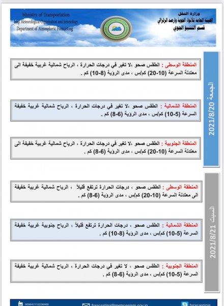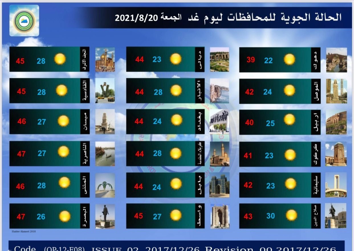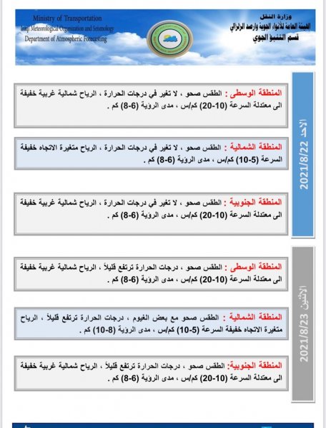 وقالت الهيئة في بيان لها ، إن "الطقس ليوم غد الجمعة سيكون صحواً ولا تغير في درجات الحرارة، فيما تكون الرياح شمالية غربية خفيفة الى معتدلة السرعة (10-20) كم/س، ومدى الرؤية (8-10) كم".واوضحت، ان "الطقس ليوم السبت المقبل سيكون صحوا، ودرجات الحرارة سترتفع قليلاً، والرياح ستكون شمالية غربية خفيفة الى معتدلة السرعة (10-20) كم/س، ومدى الرؤية (6-8) كم".واضافت، ان "الطقس ليومي الأحد والأثنين المقبلين سيكون صحواً مع ارتفاع طفيف لدرجات الحرارة، وحركة الرياح ستكون شمالية غربية خفيفة إلى معتدلة السرعة (10-20) كم/س، ومدى الرؤية (6-8) كم".وأدناه تفاصيل حالة الطقس للأيام المقبلة بحسب ما نشرته هيئة الأنواء الجوية: