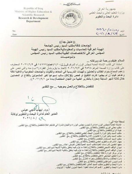 أصدرت وزارة التعليم العالي والبحث العلمي، اليوم الإثنين، قراراً مشدداً وجه إلى جميع الجامعات والكليات والمعاهد الحكومية والاهلية، ينص على عدم السماح بدوام الطلاب والعاملين واعضاء الهيئات التدريسية اذا لم يجلبوا ما يثبت تلقيهم لقاح فيروس كورونا.