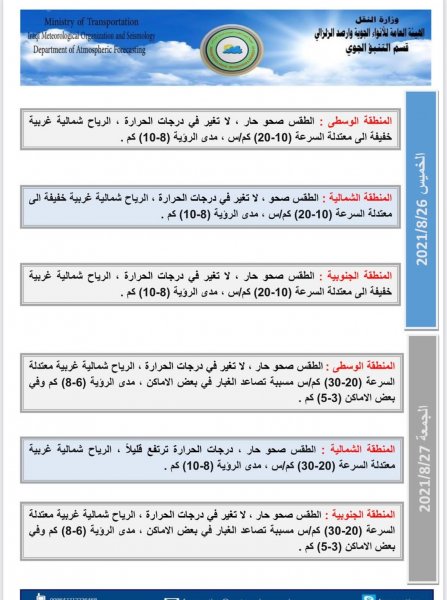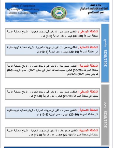 ".وأشار البيان إلى أن "يوم السبت سيكون الطقس في المنطقة الشمالية صحواً ، ولا تغير في درجات الحرارة ، والرياح شمالية غربية خفيفة إلى معتدلة السرعة (10-20) كم/س ، ومدى الرؤية (8-10) کم، أما المنطقة الجنوبية فيكون الطقس صحواً حار ، ولا تغيير في درجات الحرارة ، والرياح شمالية غربية معتدلة السرعة (20-30) كم/س مسببة تصاعد الغبار في بعض المناطق , ومدى الرؤية (6-8) کم وفي بعض الاماكن (3-5)كم، فيما سيكون الطقس في المنطقة الوسطى صحواً حار ، ولا تغيير في درجات الحرارة ، والرياح شمالية غربية معتدلة السرعة (20-30) كم/س ومدى الرؤية (8-10) کم".ولفت الى أن " طقس يوم الاحد المقبل سيكون صحو حار ، ولا تغير في درجات الحرارة ، والرياح شمالية غربية خفيفة إلى معتدلة السرعة (10-20) كم/س ، ومدى الرؤية (8-10) کم" .