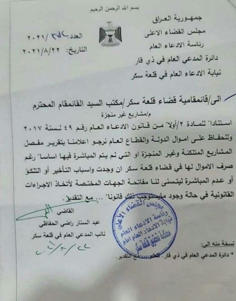 بالوثيقة.. الادعاء العام يطالب بتقارير عن مشاريع متلكئة في قضاء قلعة سكر بذي قار