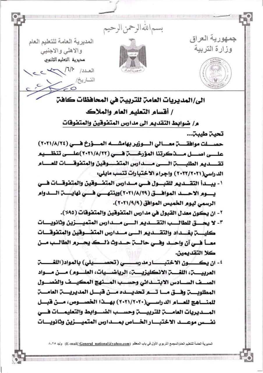 اصدرت وزارة التربية، اليوم الاربعاء، ضوابط التقديم الى مدارس المتفوقين والمتفوقات للعام الدراسي 2021 – 2022 .