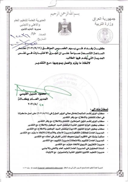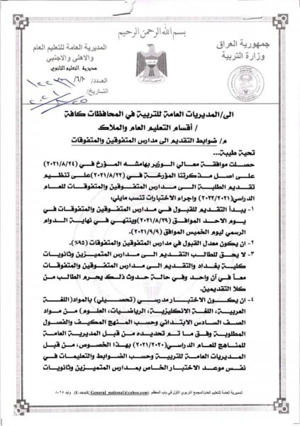 وذكرت الوزارة في بيان لها، ان "التقديم لمدار المتفوقين والمتفوقات يبدأ يوم الأحد الموافق 29 آب لعام 2021، وينتهي في نهاية الدوام الرسمي ليوم الخميس الـ9 من شهر أيلول المقبل"، مشيرا الى ان "ضوابط التقديم، تنص على قبول الطالب في مدارس المتفوقين والمتفوقات من الحاصلين على معدل (95%)".واضاف "لا يحق للطالب التقديم الى مدارس المتميزين وثانويات كلية بغداد، والتقديم الى مدارس المتفوقين والمتفوقات معاً في آن واحد"، مبينا انه "في حالة حدوث ذلك يحرم الطالب من كلا التقديمين".وتابع ان "الاختبار مدرسي (تحصيلي) بالمواد (اللغة العربية ، اللغة الإنكليزية ، الرياضيات ، العلوم) للصف السادس الابتدائي وحسب المنهج المكيف والفصول المطلوبة وفق ما تم تحديده من قبل المديرية العامة للمناهج للعام الدراسي (2020 – 2021) بهذا الخصوص".وبشأن موعد اختبار مدارس المتميزين وثانويات كلية بغداد، ذكر البيان ان "موعد الاختبار الخاص بمدارس المتميزين وثانويات كلية بغداد سيكون يوم الخميس الموافق (16 أيلول 2021) عند الساعة التاسعة صباحاً على ان تجري الاختبارات في نفس المدرسة التي يقدم فيها الطالب" .![]()