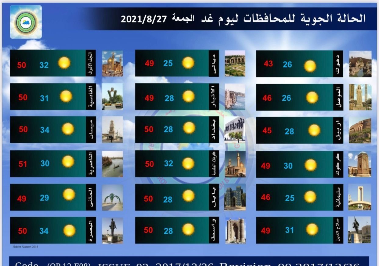 وذكر بيان للهيأة ، أن "الطقس ليوم غداً الجمعة سيكون في المنطقة الشمالية صحو، ودرجات الحرارة ترتفع قليلاً، والرياح شمالية غربية خفيفة الى معتدلة السرعة (10-20) کم/س، ومدى الرؤية (8-10) کم ، فيما سيكون الطقس في المنطقة الجنوبية صحو حار، ولا تغير في درجات الحرارة، والرياح شمالية غربية خفيفة الى معتدلة السرعة (10-20) کم/س تنشط في الاقسام الشرقية الى (30-40)كم/س ، ومدى الرؤية (6-8) کم وفي الغبار(4-6)كم ،أما المنطقة الوسطى فسيكون الطقس صحو حار، ولا تغير في درجات الحرارة، والرياح شمالية غربية خفيفة الى معتدلة السرعة (10-20) کم/س تنشط في الاقسام الشرقية الى (30-40)كم/س ، ومدى الرؤية (6-8) کم ".