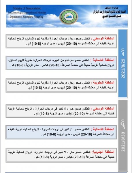 وأضافت أن "طقس ليوم السبت سيكون في المنطقة الشمالية صحو مع قطع من الغيوم ،ودرجات الحرارة ترتفع قليلاً، والرياح شمالية غربية معتدلة السرعة (20-30) کم/س ، ومدى الرؤية (8-10) کم، أما في المنطقة الجنوبية والوسطى فسيكون الطقس صحو حار، ولا تغير في درجات الحرارة، والرياح شمالية غربية معتدلة السرعة (20-30) کم/س ،ومدى الرؤية (6-8) کم ".وأشار البيان إلى أن "يوم الاحد سيكون الطقس صحوا مع قطع من الغيوم، ولا تغير في درجات الحرارة ، والرياح شمالية غربية خفيفة إلى معتدلة السرعة (10-20) كم/س ، ومدى الرؤية (8-10) کم".ولفت الى أن "الطقس ليوم الاثنين المقبل سيكون صحوا، ولا تغير في درجات الحرارة ، والرياح شمالية غربية خفيفة إلى معتدلة السرعة (10-20) كم/س ، ومدى الرؤية (8-10) کم".![]()