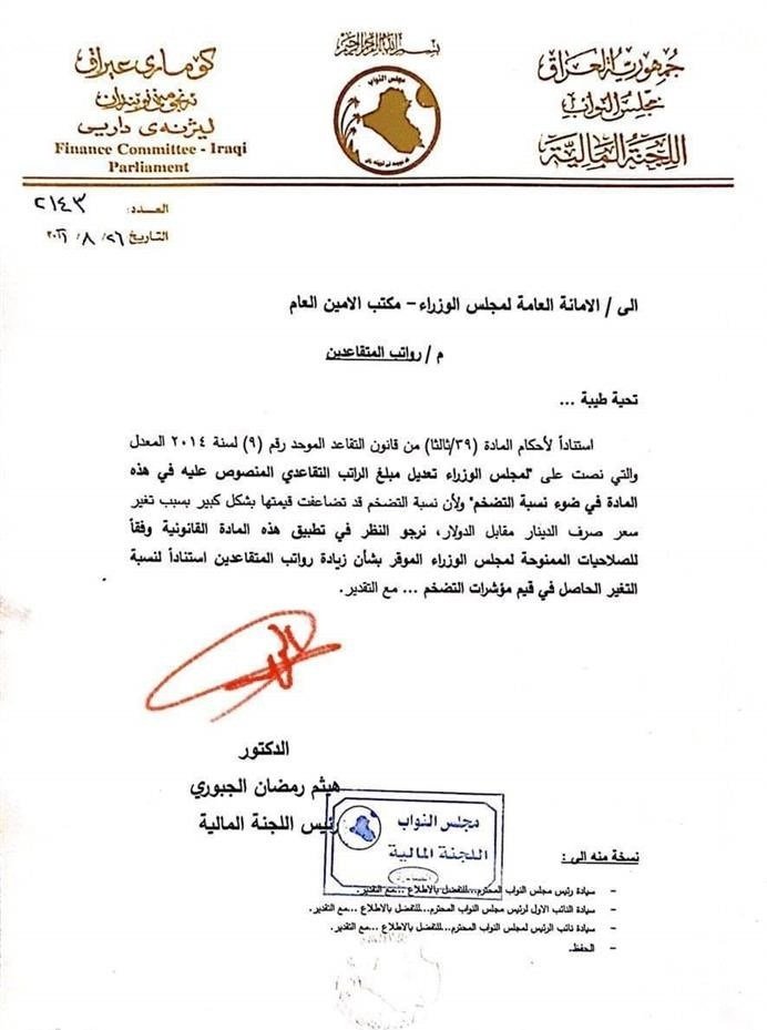 خاطب مجلس النواب العراقي، اليوم الخميس، أمانة مجلس الوزراء بشأن رواتب المتقاعدين .