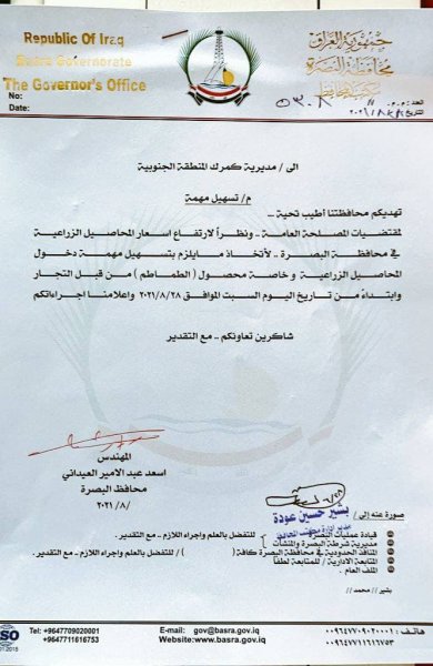 حصل صحفي على وثيقة صادرة من مكتب محافظة البصرة أسعد العيداني، لتسهيل ادخال المحاصيل الزراعية الى المحافظة.