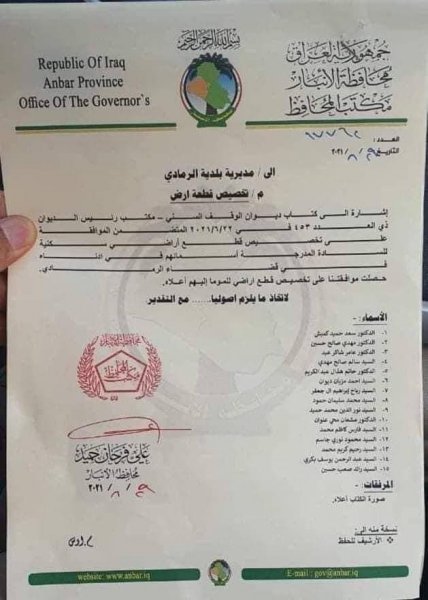 وبحسب الوثيقة، فأن محافظ الانبار علي فرحان الدليمي وجه بلدية المحافظة بالعمل على إجراء اللازم وتخصيص قطع الأراضي.