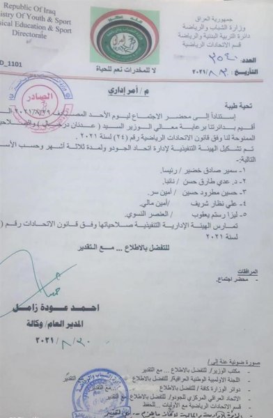 اصدرت وزارة الشباب والرياضة كتابا رسميا تضمن اختيار هيئة تنفيذية جديدة لاتحاد الجودو لمدة ثلاثة أشهر مقبلة. وتم البت الموضوع بعد تدخل وزير الشباب و الرياضة عدنان درجال وعقد جلسة تفاهم بين أصحاب الآراء المختلفة باتحاد الجودو وتم الاتفاق على وضع خارطة طريق جديدة و نهاية جميع الخلافات خدمة للعبة. وتالف المجلس أو الهيئة التنفيذية الجديدة من سمير صادق رئيسا وعدي طارق نائبا وكلف حسين مطرود بامانة السر وعلي نظار للأمانة المالية وليزا يعقوب عن النساء ممثلة.