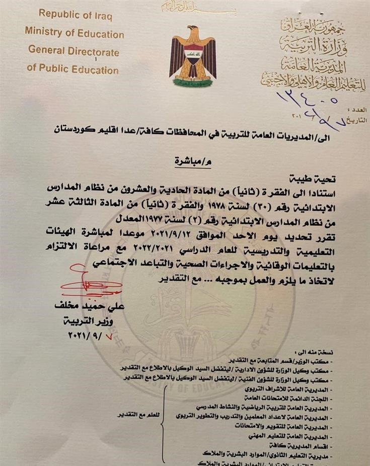 وقالت الوزارة في بيان لها، انها "قررت تحديد الـ12 من شهر أيلول الحالي ، موعداً لمباشرة الهيئات التعليمية والتدريسية في المدارس للعام الدراسي الجديد 2021– 2022 ، وذلك من أجل وضع الجداول والترتيبات الكفيلة لانجاح امتحانات الدور الثاني للمراحل غير المتتهية ، واتخاذ الإجراءات المناسبة لضمان انتظام الدراسة في موعدها المقرر".