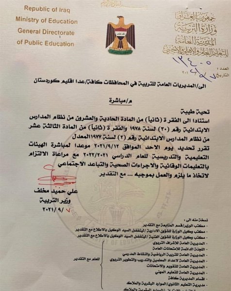 وأضافت ان "المديرية العامة للتعليم العام والأهلي والأجنبي وجهت المديريات العامة للتربية في المحافظات كافة / عدا إقليم كردستان ، باعتماد يوم الأحد الموافق الـ 12 من أيلول الجاري ، موعداً لمباشرة الملاكات التعليمية والتدريسية في المدارس ، مع الأخذ بضرورة مراعاة الالتزام بالتعليمات الوقائية والصحية ، وكذلك التقيد بالتباعد الاجتماعي". ![]()