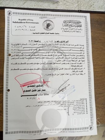 وجاء في صيغة الأمر الاداري، الصادر عن محافظ صلاح الدين، أنه "استنادا للصلاحية الممنوحة الينا كرئيس الجهة غير المرتبطة بوزارة، قررنا اعفاء جرجیس اسماعيل حجاب من مهام منصب قائممقام قضاء الشرقاط بالوكالة، واعادة تكليف علي دودح خلف حدان، للقيام بمهام منصب قائمقام قضاء الشرقاط".