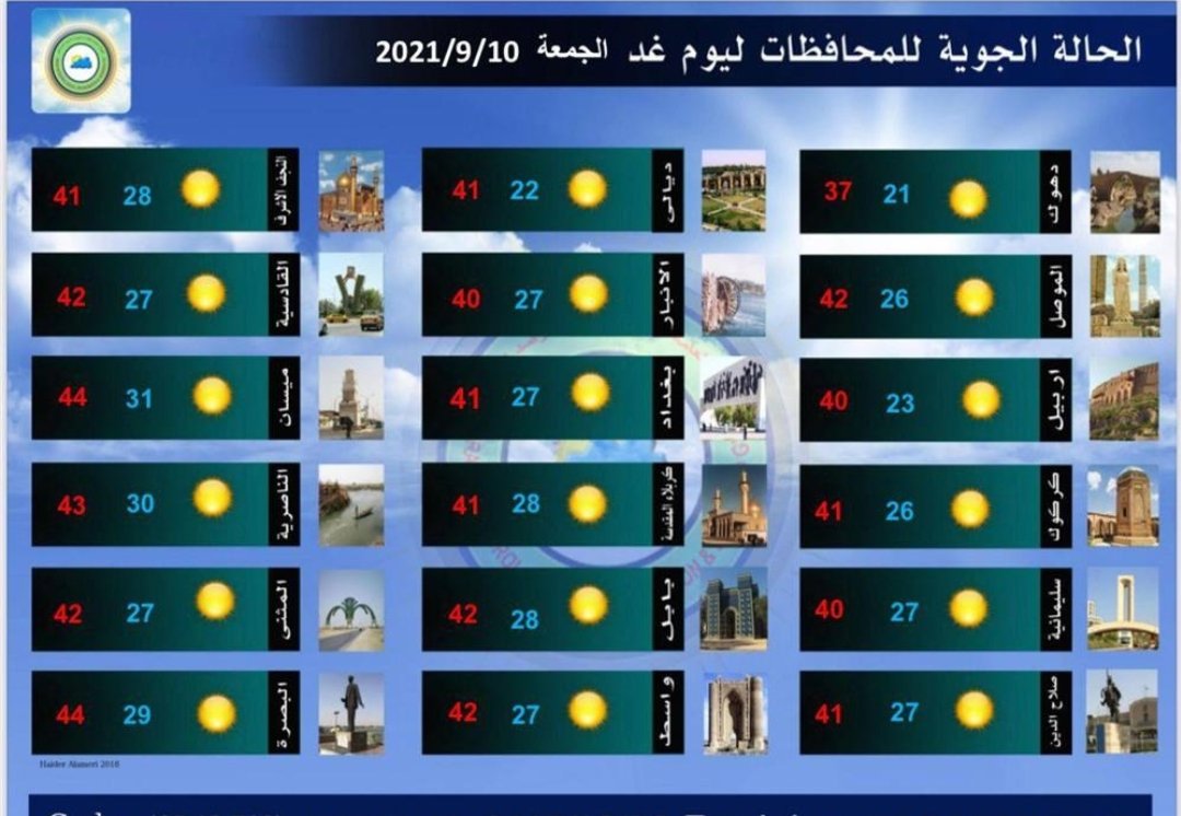 الخميس، درجات الحرارة ليوم غد الجمعة في العراق، والتي تظهر استمرار انخفاض درجات الحرارة.