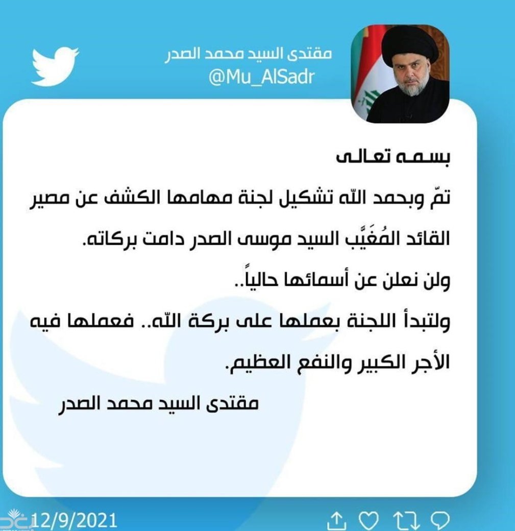 اعلنت زعيم التيار الصدري مقتدى الصدر، اليوم الاحد، خلال تغريدة له على (تويتر) تشكيله لجنة لمعرفة مصير موسى الصدر، الذي تم اتهام الرئيس الليبي الاسبق معمر القذافي.