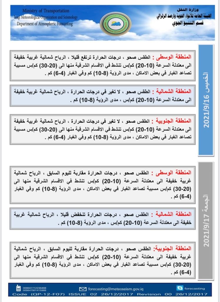 ونشرت الأنواء الجوية جداول توضح درجات الحرارة في المحافظات العراقية.