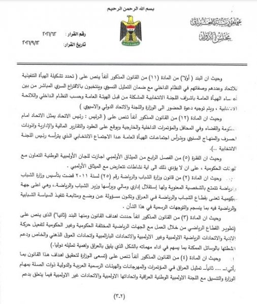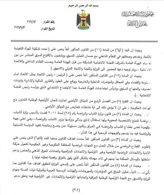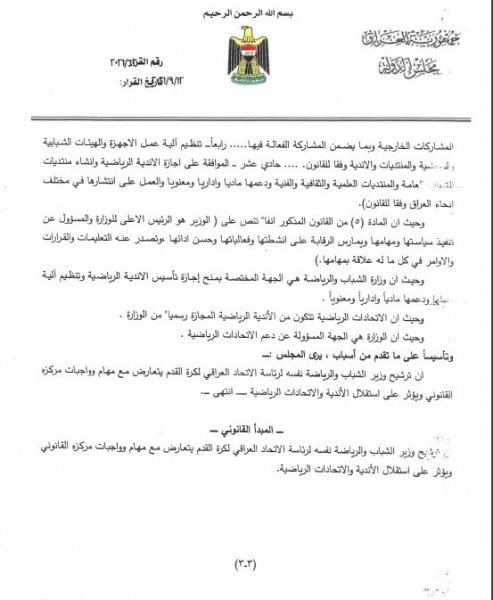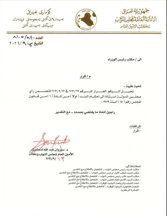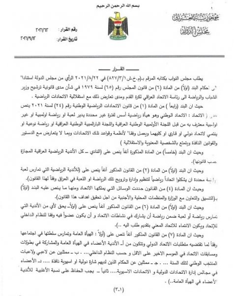 استفسرت الأمانة العامة لرئاسة مجلس النواب، من مكتب رئيس الوزراء مصطفى الكاظمي، عن مدى قانونية ترشيح وزير الرياضة والشباب عدنان درجال لانتخابات رئاسة الاتحاد العراقي لكرة القدم .