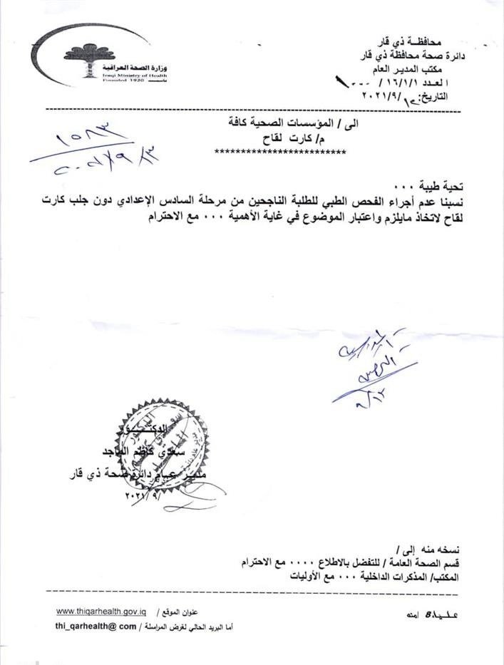 اتخذت دائرة صحة محافظة ذي قار قراراً بشأن الفحص الطبي للطلبة الناجحين من السادس الإعدادي